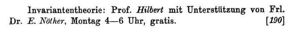 Vorträge über mathematische Prinzipien (im Lebenslauf, als „abstrakte Mengentheorie“ konkretisiert): Prof. Hilbert mit Unterstützung von Frl. Dr. Noether, Montag 4-6 Uhr, privatissime und gratis